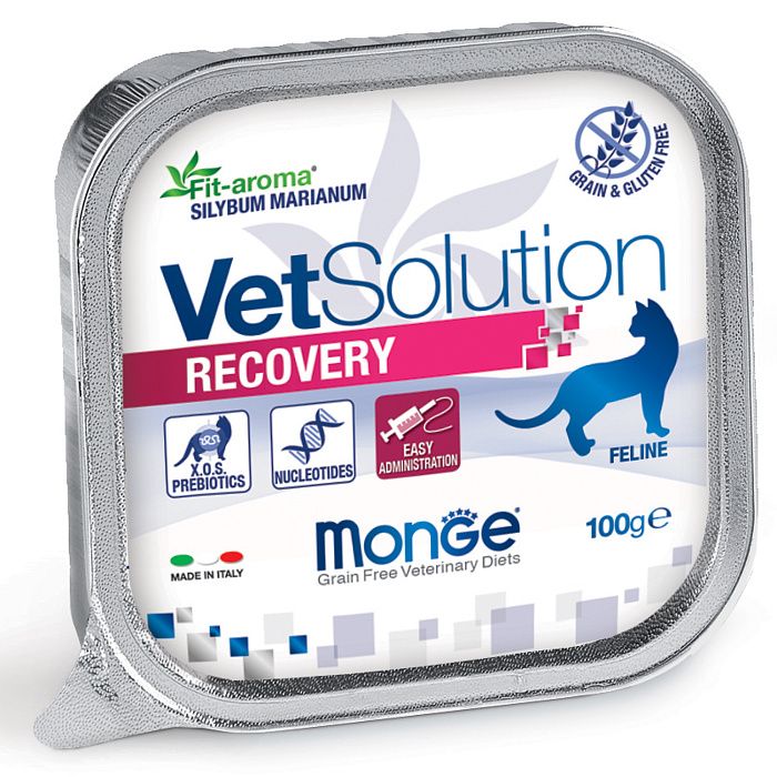 Лечебный корм Monge (Монж) VetSolution Cat Recovery Рекавери для кошек при восстановлении питания в период выздоровления, а так же анорексии, кахексии, отсутствия аппетита, при поддержке процесса восстановления при раковых заболеваниях и тяжелых травмах.
