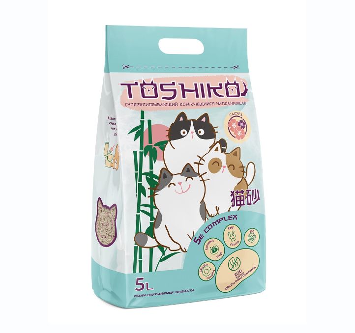 Растительный наполнитель Toshiko (Тошико) изготавливается из органических волокон хвойных пород деревьев и создан на основе инновационного комплекса 5E, позволяющего Вам проявлять заботу о питомце с легкостью. При попадании жидкости наполнитель образовывает плотный комок, который можно утилизировать в канализацию и нет необходимости в полной замене наполнителя в лотке. Не содержит вредных добавок или химических составляющих. Toshiko Сакура обладает ненавязчивым ароматом свежего зелёного чая, а неприятные запахи не просто маскирует, а деактивирует.